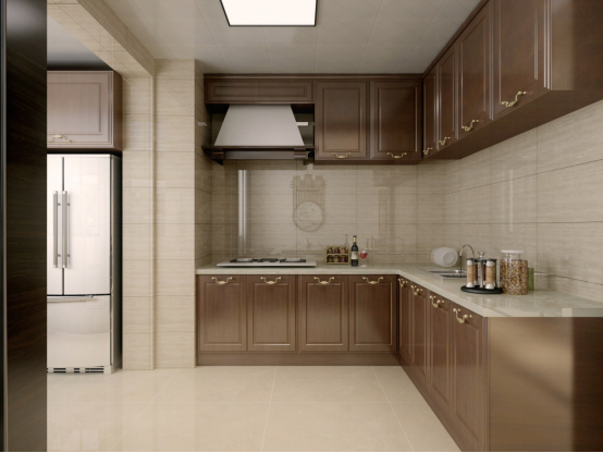 廚房采用了開(kāi)放式的設(shè)計(jì),格局上更為現(xiàn)代化,而櫥柜的造型設(shè)計(jì)又偏向于中式風(fēng)格,兩者結(jié)合,兼顧了實(shí)用性與美觀性?!癓”字型設(shè)計(jì)的櫥柜,造型古樸,柜體表面的紅褐色盡顯一種中式韻味,而地柜+吊柜的組合方式,有效增加了廚房的收納空間,看起來(lái)更加的整潔干凈。