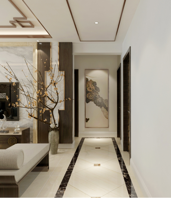 走廊地面為黑色波導(dǎo)線內(nèi)拼800*800地磚斜鋪,盡頭處的墻面則是一副中式寫(xiě)意掛畫(huà),以留白的方式用一種無(wú)實(shí)際物相的方式去表達(dá)畫(huà)面中的意境,以無(wú)相表達(dá)意象,使整個(gè)設(shè)計(jì)氛圍形神之間、若隱若現(xiàn)。