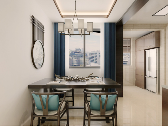 餐廳獨(dú)立的餐廳空間,每一處細(xì)節(jié)的處理都非常講究。方形的中式餐桌,以沉穩(wěn)的黑色作為主色調(diào),內(nèi)斂而又大氣。深木色的餐椅搭配碧青色的抱枕,使整體看起來(lái)更加的協(xié)調(diào)舒適。非常精致的玻璃以及白瓷餐具規(guī)整的擺放在餐桌之上,配以桌面上的木質(zhì)裝飾,既顯高雅格調(diào),又不失清新之感。